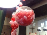 The 2 side towers using heart shaped and round shaped balloons made the tower looked different. The centre is a 3 feet clear balloon stuffed with almost 200 6" heart shaped balloons, which is the highlight of the decor. The couple's intention was to stand under the 3 feet heart shaped filled balloon and when the solemnization finished, the Pastor would burst the 3 feet clear balloon and all the heart shaped balloons would dropped down.